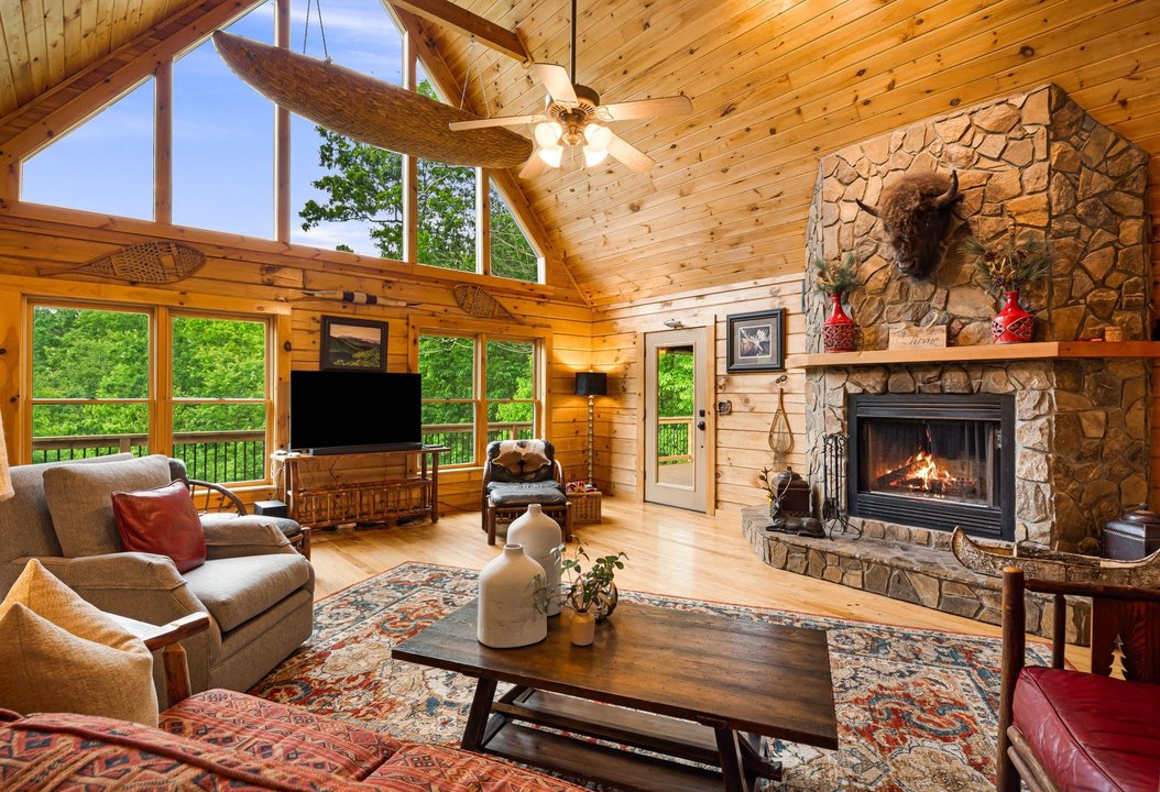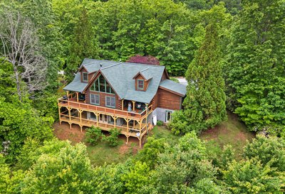 Change your perspective at Sydney Falls Cabin, a classic three-story timber frame log home near Black Mountain, NC. This Catawba Falls Preserve rental is nestled in a 900-acre community bordering Pisgah National Forest, with over a hundred acres designated as common areas for exploration. An on-site network of hiking trails leads to the Catawba River and the stunning, cascading Catawba Falls. Treat yourself to a premier home centered around light-filled gathering areas, where sumptuous lodge decor sets the scene for your mountain getaway. Conversation starters abound, from a buffalo head mounted on the hearth to a reed boat hanging from the rafters and a striking collection of rustic twig furniture. The centerpiece two-story stone fireplace provides ambiance for evenings in the main living area, where a wall of windows allows you to gaze at the stars while sitting by the fire. For those who enjoy cooking and entertaining, the gourmet kitchen and round dining table blend seamlessly from oven to table, with an outdoor dining area that stays comfortably shaded all day and a gas grill for al fresco meals.