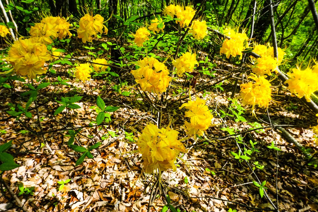 Our trails are bursting with color, including this early Flame Azalea. In our region of the Blue Ridge Mountains and Pisgah National Forest, a variety of rhodendron is in bloom now through the end of June, some at the higher elevations will bloom into early July. Elevations above 3,000 feet provide ideal blooming conditions for native rhododendron. Our website includes area trails and waterfalls. Join us for a day outside!