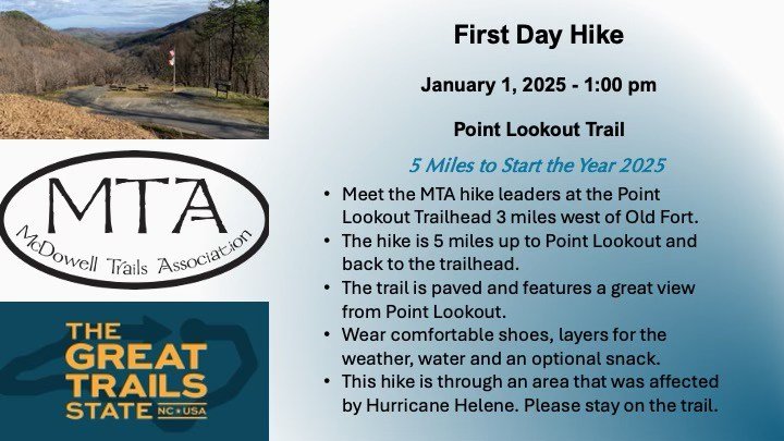 Join the MTA on a 5-mile hike to Point Lookout on Wednesday, January 1, 2025 during their First Day Hike in Old Fort. The Old Fort Trailhead is located at the end of Old Highway 70 about 3 miles west of Old Fort. Google Maps Link: https://maps.app.goo.gl/QwLRy8EpVDm6k6Fa9