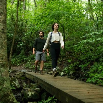 The trail begins with a switchback to the top of the ridge and then descends to Hickory Branch. Depending on the water height, you may be able to rock-hop, but be prepared to get wet. Continue on to enjoy the flowering bushes in a scenic cove. Keep an eye out for a rocky outcropping – almost like a wall - on your left where you’ll see Hickory Branch Falls to your right. Travel over the hills, passing many falls along the way. The trail ends after another climb through a pine forest to the ridge and then back down through more woodland. Most of the 3000-ft elevation occurs at this end of the hike.