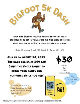 The mysterious creature known as Bigfoot — or Sasquatch — is reported to have wandered the mountains of Western North Carolina for years. But on August 23rd, 2025, from 10 AM to 5 PM, Bigfoot’s whereabouts will be no mystery. He’ll be celebrating with fans of all ages at the fourth-annual WNC Bigfoot Festival in historic downtown Marion.