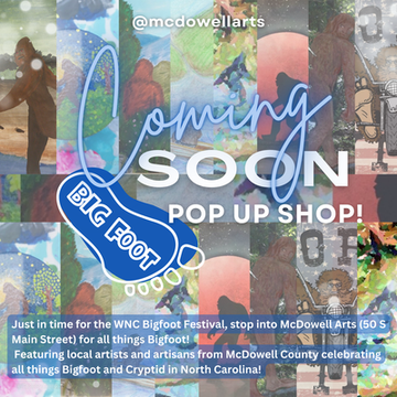The McDowell Arts Council Association (MACA) on Main Street will be collaborating with CreepGeeks Podcast to host their Bigfoot Pop-Up Shop, featuring a curated collection of fine art, heritage crafts, and handmade items with a cryptid and Sasquatch theme. Items available at MACA are made or produced exclusively by local artists in the region, so it's a great way to support locally made art and local Bigfoot entertainment.