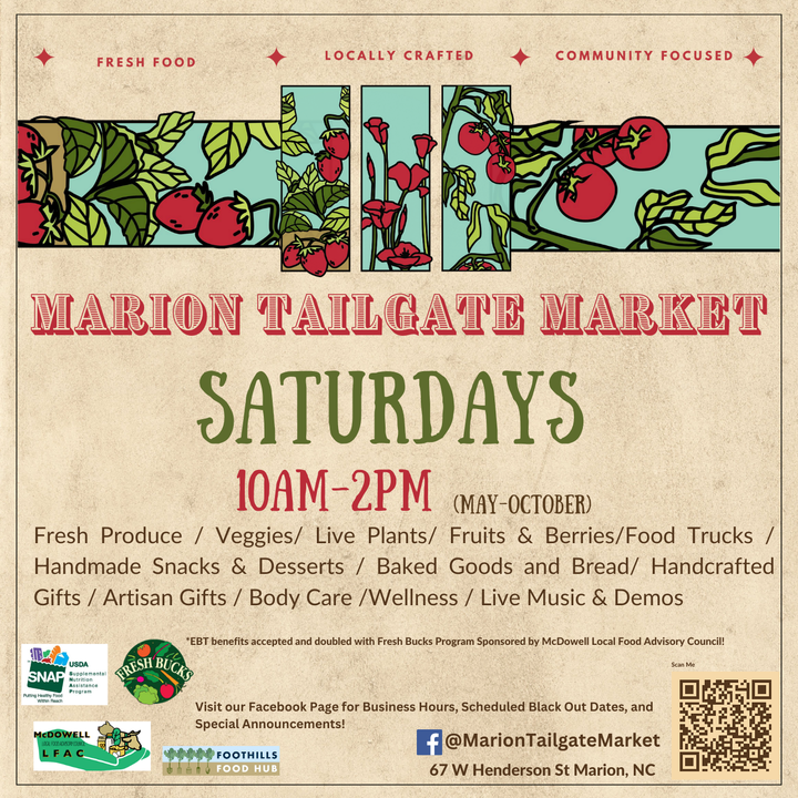 Find fresh bread, jellies and preserves, fresh flowers, and more, all locally grown and made. Come out and support your local growers and makers, and enjoy our beautiful downtown! Visit our website, https://foothillsfoodhub.org/tailgate-market or find us on Facebook, https://www.facebook.com/mariontailgatemarket for more information.