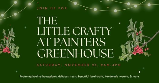 Join Painters Greenhouse on Small Business Saturday for the second annual Little Crafty! This special holiday event features Christmas trees, locally made holiday wreaths and decor, garden art and tools, pottery and, of course, plants! The plant selection includes houseplants and holiday bloomers. Local vendors will be on site with treats, crafts, goods and so much art! Come pick out your tree and get your holiday shopping done while enjoying a beverage from The Coddiwompler Mobile Cafe - https://thecoddiwompler.com, a holiday atmosphere and the magic of Painters Greenhouse.