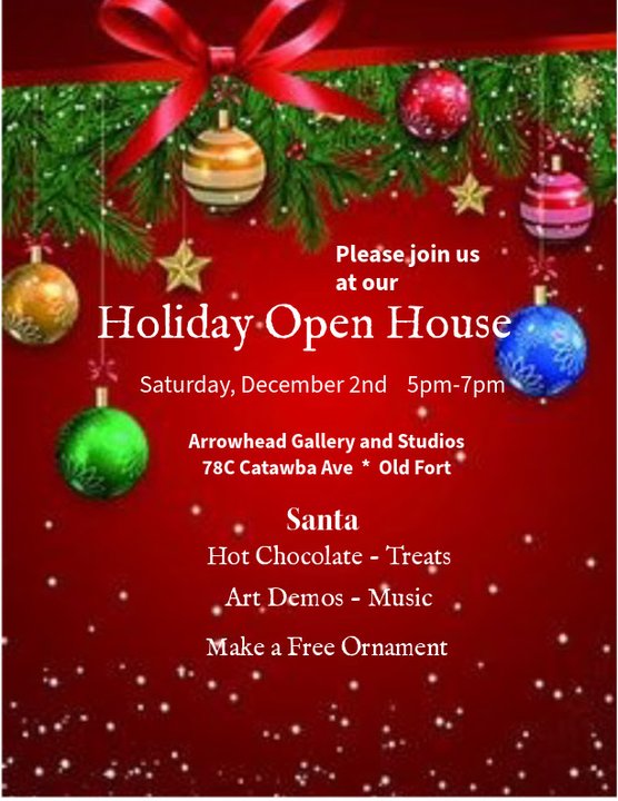 Join the fun at the 2nd annual Holiday Open House. Enjoy treats, a visit from Santa, hot cocoa, music, art demonstrations, ornament making and a gift basket raffle. The gallery features numerous artists, so it's a great place for holiday shopping too! Contact Arrowhead Gallery & Studios for more information, 828-668-1100.