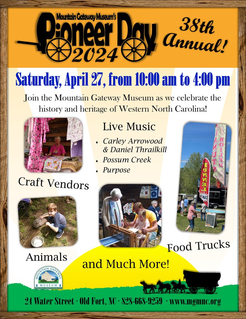 Featuring Southern Appalachian crafters, live music, food trucks, inflatables, antique tools and equipment, special exhibits, and much more. Craft demonstrations will include blacksmithing, woodworking, quilting, crocheting, pottery, basket making, chair caning, spinning, weaving, dyeing, jewelry making and others. Many crafters also will have items for sale. A variety of food trucks will be available.
