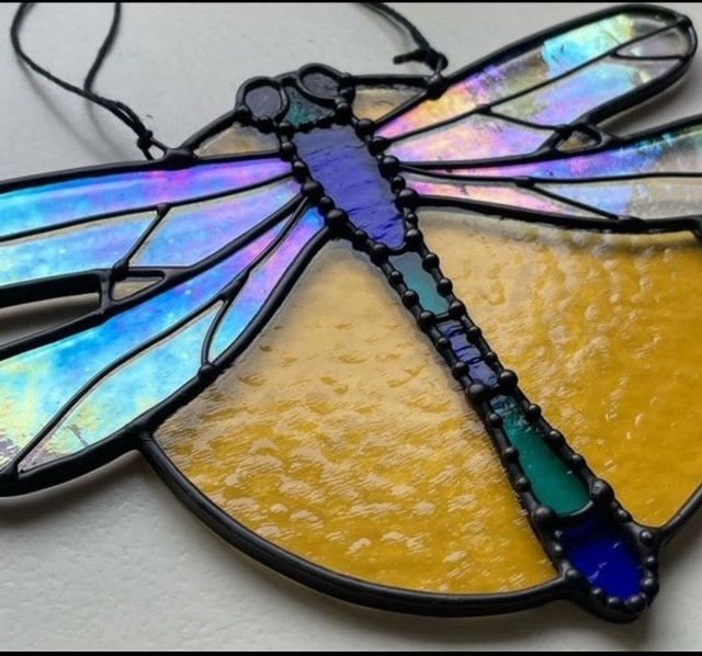 New version of our dragonfly pattern with wire work and decorative soldering. We will also go over a patina technique to age our solder to black if desired. Students will clean, foil, flux and solder glass then add hardware.