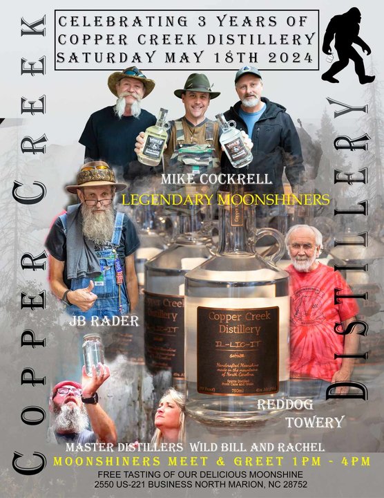 Join us May 18th from 1pm to 4pm for our 3 year Anniversary and Moonshiners Meet and Greet! Come help us celebrate 3 years of Copper Creek Distillery in beautiful Marion, NC! Come meet Moonshiners such as Mike Cockrell, JP Rader, Reddog Towery, Master Distillers Wild Bill and Rachel and more! It is the weekend of The Bigfoot Festival so there will be plenty to do and see! Make plans to join us now!