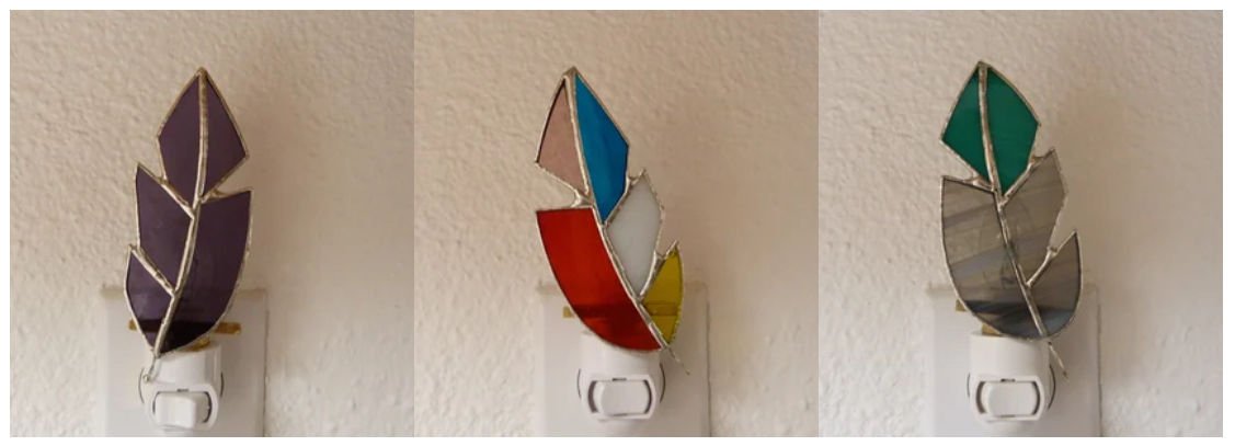 Pretty feather night light in your choice of color palette. Please state your palette preference at time of registration... warms, cools, etc. Glass is precut, Students will clean, foil, flux, and solder their piece and learn how to secure to brass nightlight hardware.