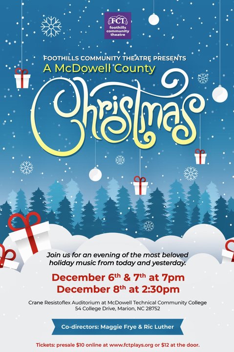 Join us for an evening of the most beloved holiday music from today and yesterday. Crane Resistoflex Auditorium at McDowell Technical Community College. Tickets: Presale $10 online or $12 at the door.