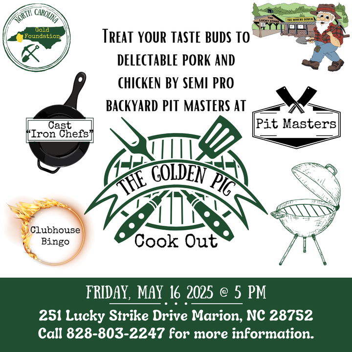 Treat your taste buds at The Golden Pig Cook Out on Friday, May 16 at 5 pm. We will have semi pro Backyard Pit Masters serving up some delectable pork and chicken (plus sides) just for you!