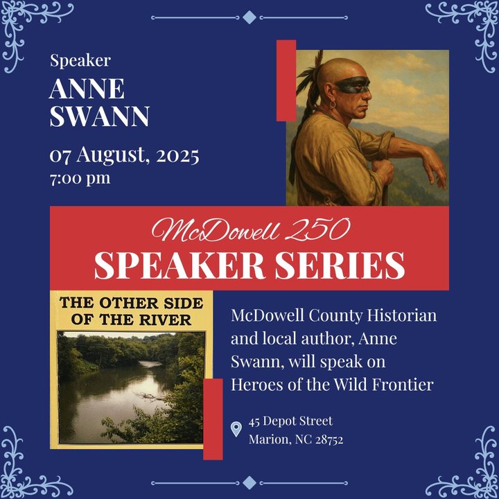 McDowell County Historian and Local Author, Anne Swann, will speak on "Heroes of the Wild Frontier". Part of the America 250 McDowell County Speaker Series.